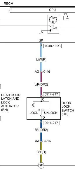 Yes, but I said the WINDOW switch connectorThese Mazda schematics seem to be throwing me off everytime. I see a connector 0914-217 for the Door Lock Switch (RH) and only two pins populated. One (L/R) comes from the RBCM position 3F and the other (B/L) goes to GND. The terminal voltage table shows 3F to be 4.5V when the switch is not activated.