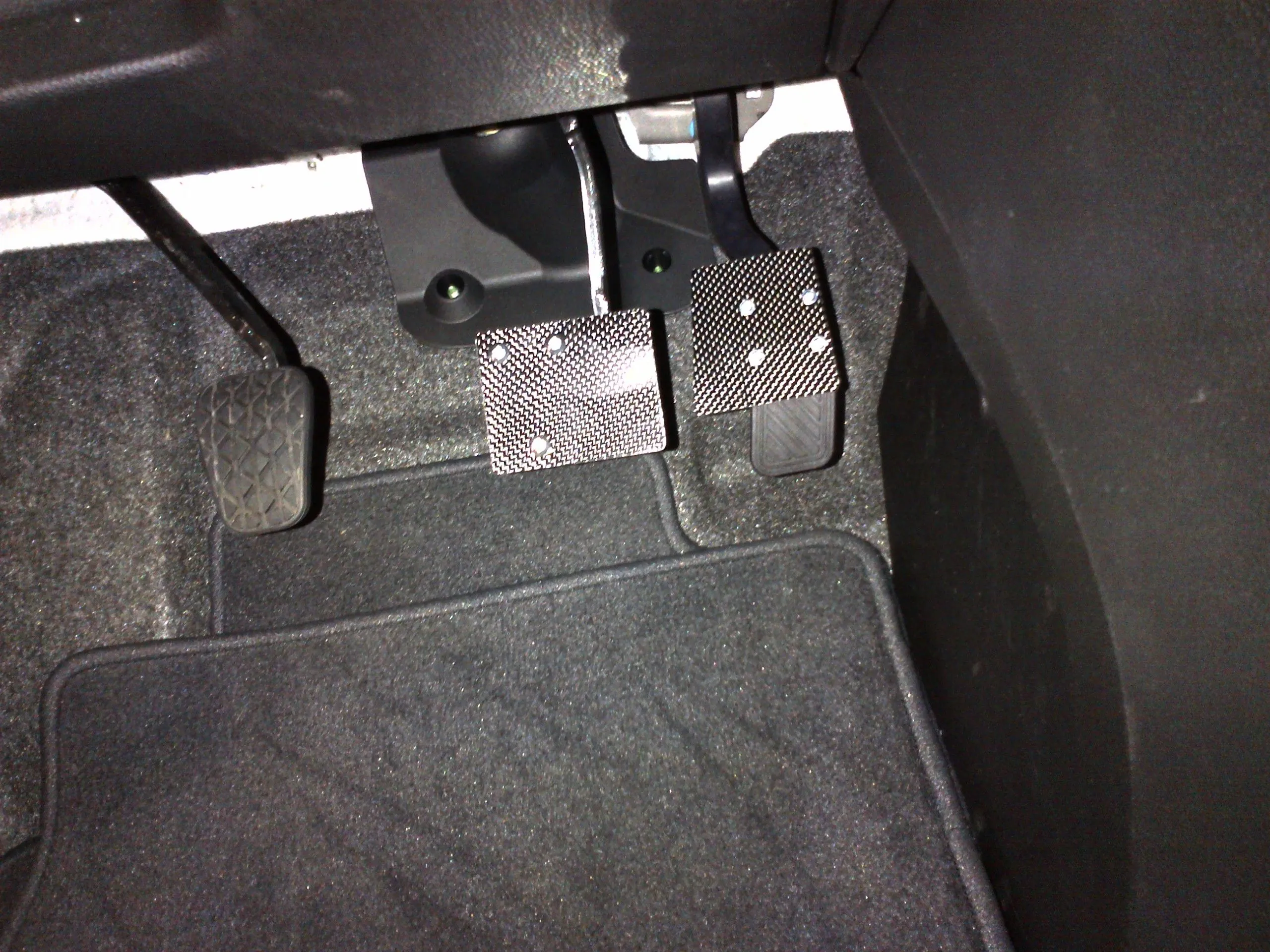 Fabrication complete, I may need to adjust height after driving. Throttle is solid carbon fiber. Brake is 4130 plate covered with CF, oem pad removed, bottom bolt has a 4130 plate under oem pedal to distribute load, top use washers only. Spacers can be added between 4130 plate and oem pedal to adj. height.