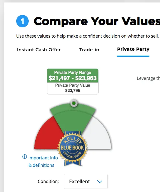 I record my trade value quarterly and have so far used "excellent". I'll be knocking it down to very good next time as it is now a 2 year old model with 13,000+ miles. It's super clean, just a couple of small paint chips, but I see dealers offering the same vehicle within 200 miles with a few more miles on them at or near what KBB shows as an excellent trade value, a dog that wouldn't hunt. In private party sale I suppose you never know. Somebody who really wants the car and doesn't like negotiating may pay up. How often does that happen on a $20,000 vehicle?
