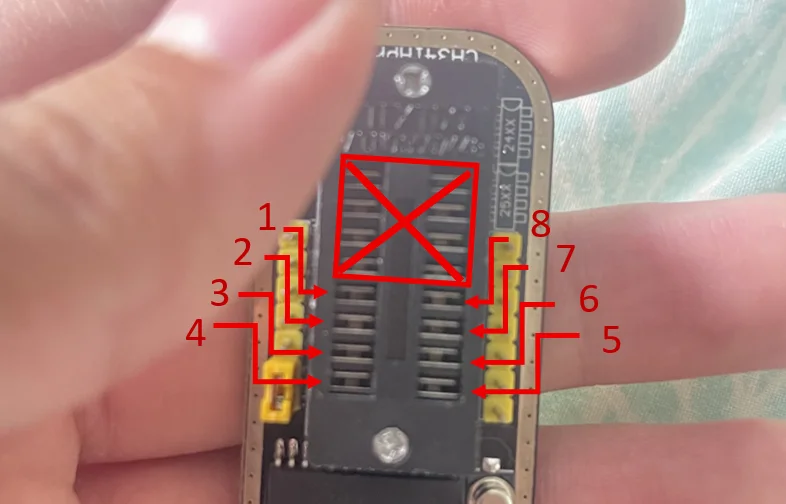 4. Once correctly wired, use the EEPROM clip and )clip onto the cluster EEPROM. Mazda engineers are nice enough to put numbers on the edge of EEPROMs to show you which pin number is which; make sure that pin 1 on the clip (red wire) connects to pin 1 of the EEPROM. This may take some time as it can be very fiddly. Be patient. You will know when a complete connection is made when the green RUN light on the CH341A board is lit. You may have to hold onto the EEPROM clip to ensure good contact with the EEPROM.