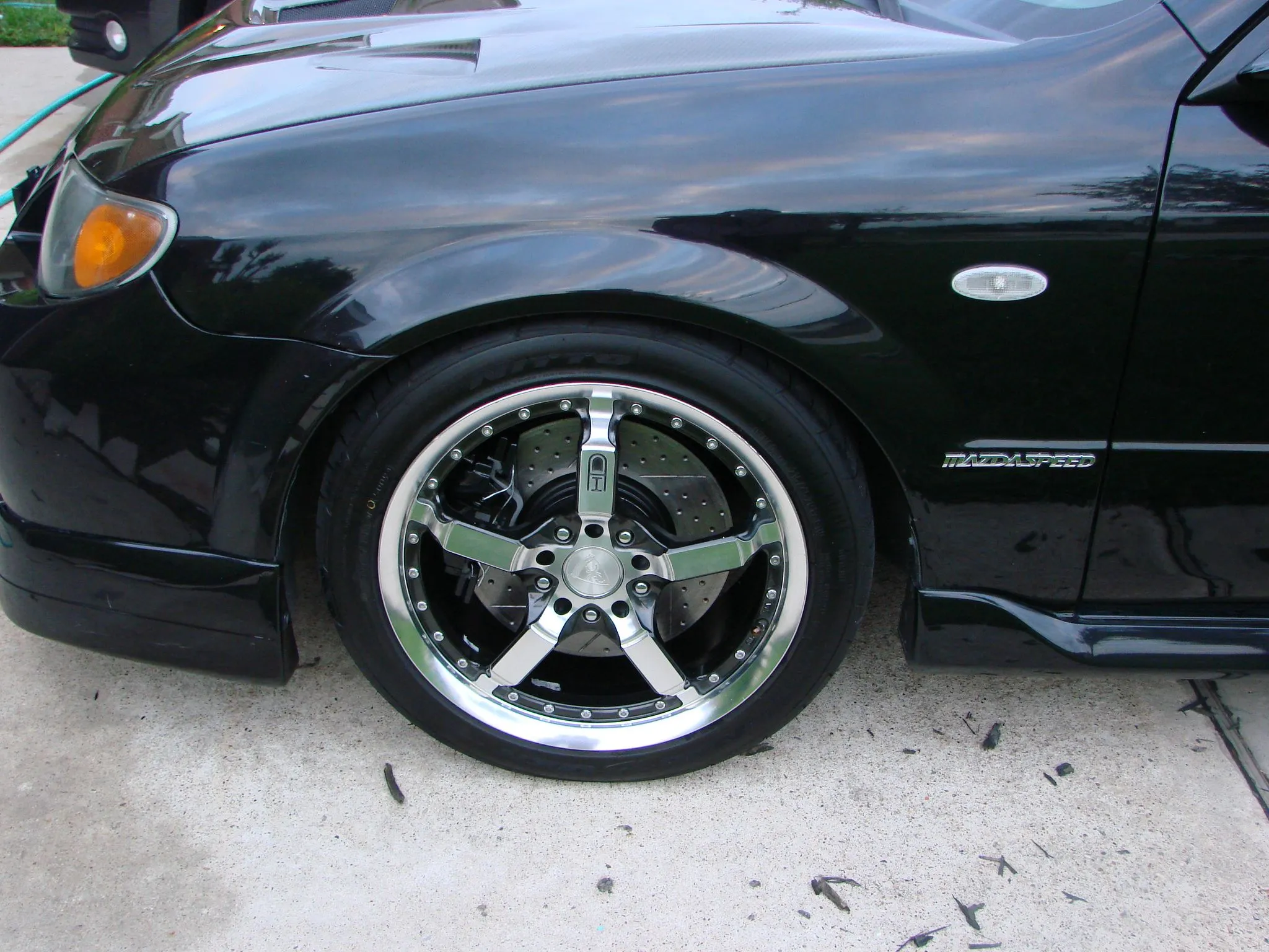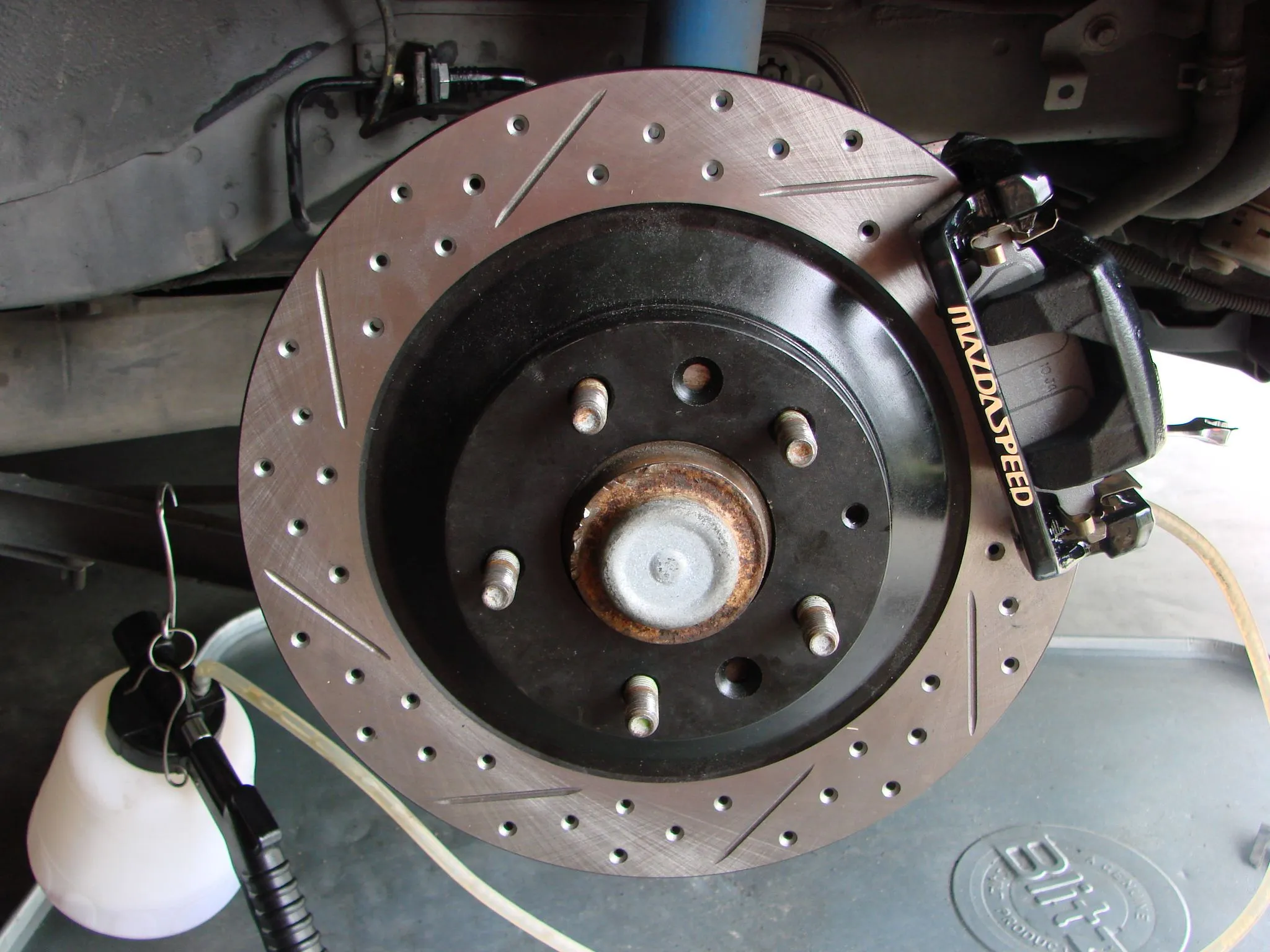 Parts needed for both front and back install will require Front and Rear Calipers with Brackets, Rotors and E-brake Cables from an 06-07 MazdaSpeed 6. You can use OEM Mazdaspeed Protege brake hoses or Braided brake hoses on 03 and 03.5 MazdaSpeed Protege.