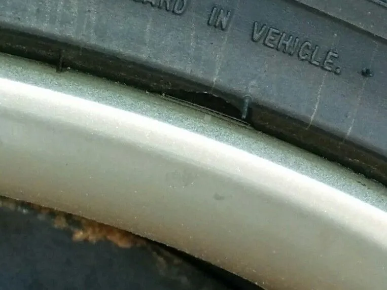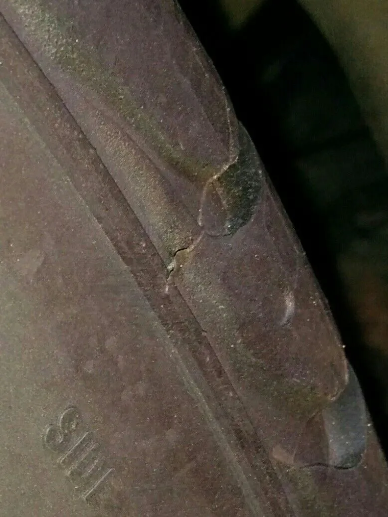 I see a crack in the first pic and the second it looks like there is a chunk missing altogether from the tire where it meets the rim.