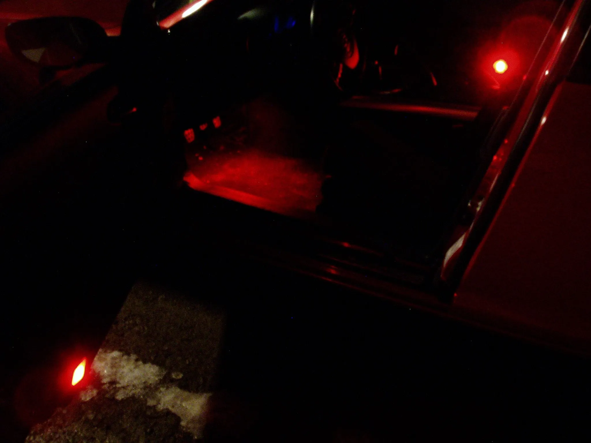 My camera is old and un-awesome and doesn't take "in-focus" pictures in low-light...but low-light is the only way to see the interior LEDs so the first picture's fuzzy but you get the idea...red LED door lights and footwell lights.