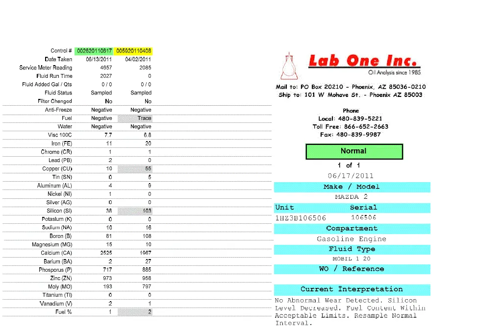 Yes ddawson, first sample analyzed was on OEM oil. I changed that oil out at ~2600 miles. Replaced it with Mobil 1 0W-20 as that is what my Mazda parts supplier had. I thought that Castrol may have supplied that oil, however my understanding is that ENEOS can also supply Mazda Japan with "brake-in" oil. The additive package in the break-in oil looked just fine, I was concerned with the larger wear metal suspended in the oil. Those particles are gone and my engine is free to make some more, however at a much reduced rate. I will resample in another 2K and if it looks fine, then at 6K on oil and change-out at 7,500 per schedule A or B, whichever is the milder duty cycle.