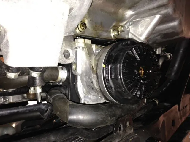 I removed the 4 bolts holding the old oil filter assembly. If you have done this before you probably remember there is one bolt that is hard to remove thanks to this hose. I read somewhere not to remove this hose as it contains coolant. Anyway now the oil filter is hanging there suspended by these two black hoses connected to this black box looking thing above the filter (see pic).