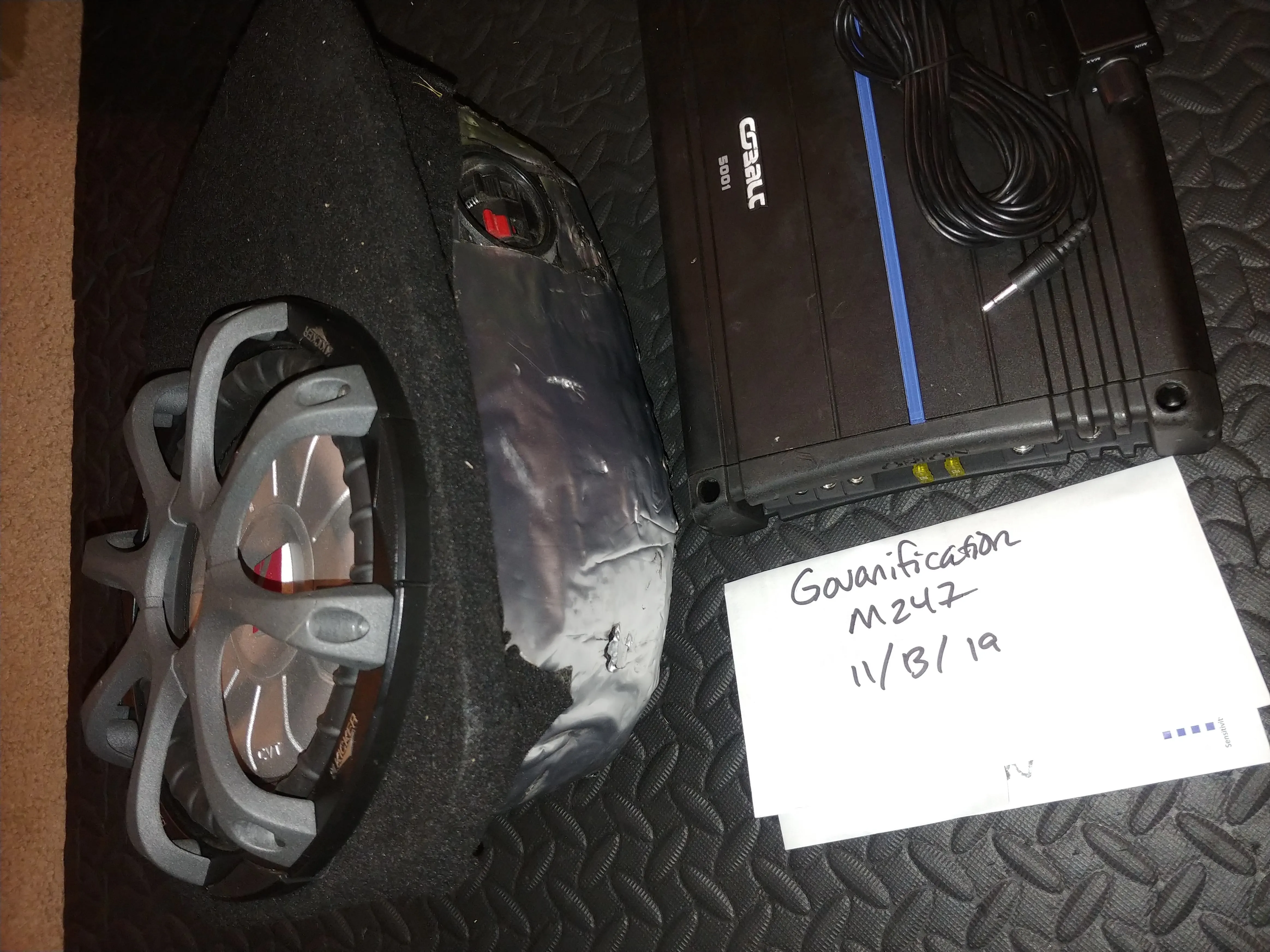 Custom fiberglass + dynamat enclosure that fits perfectly and bolts into to spare tire jack spot in hatch, plus 8" 4ohm Kicker sub & Orion Cobalt CO5001 amp. This puppy was custom made for the Gen1 MS3 and MZ3 and is the best way to add bass without sacrificing trunk space as it mounts into the sidewall (you will have to relocate the jack, possible in several places).