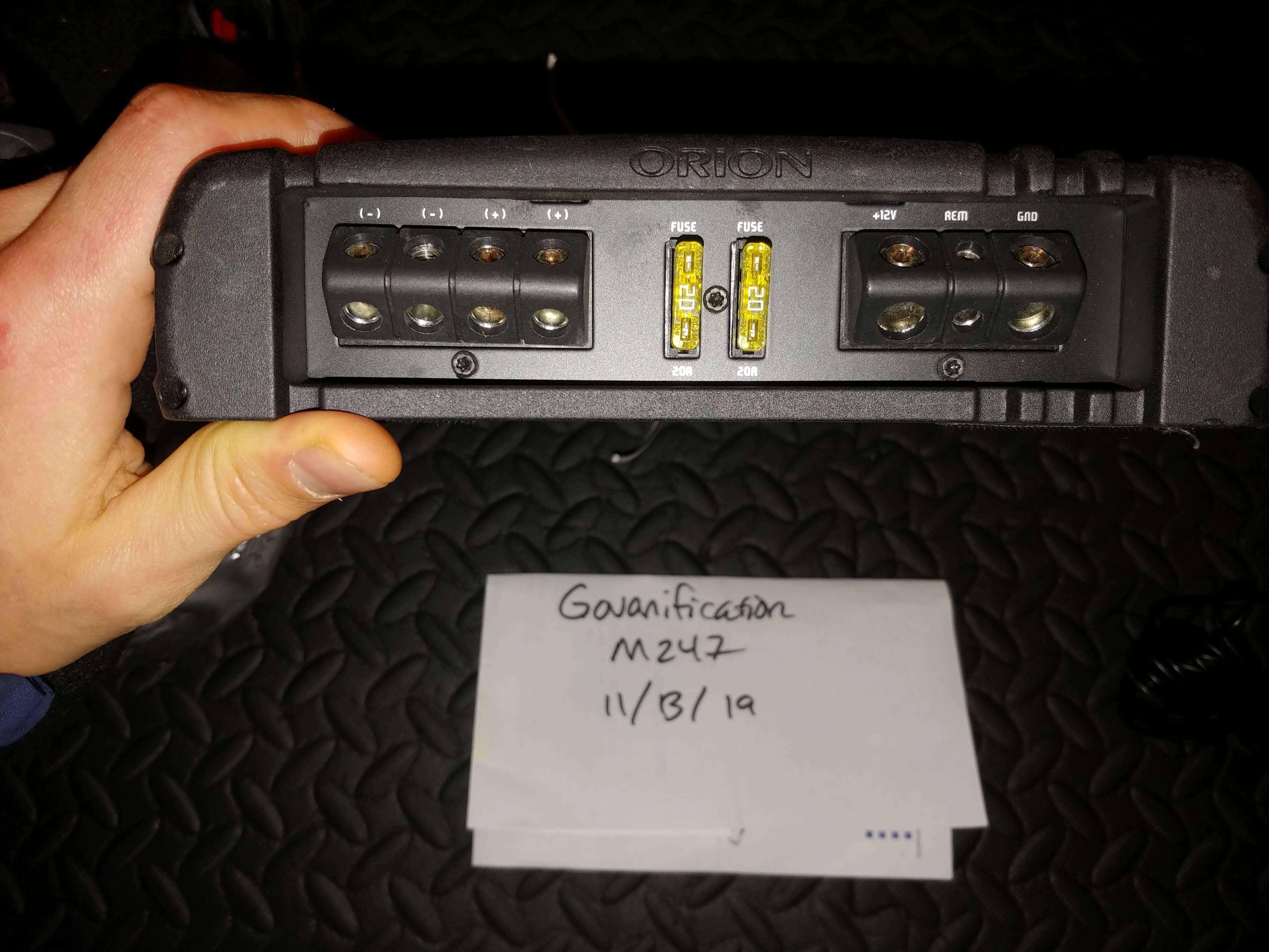 Orion Cobalt CO5001 amp (see attached user manual for full specs), has velcro strips on bottom for mounting