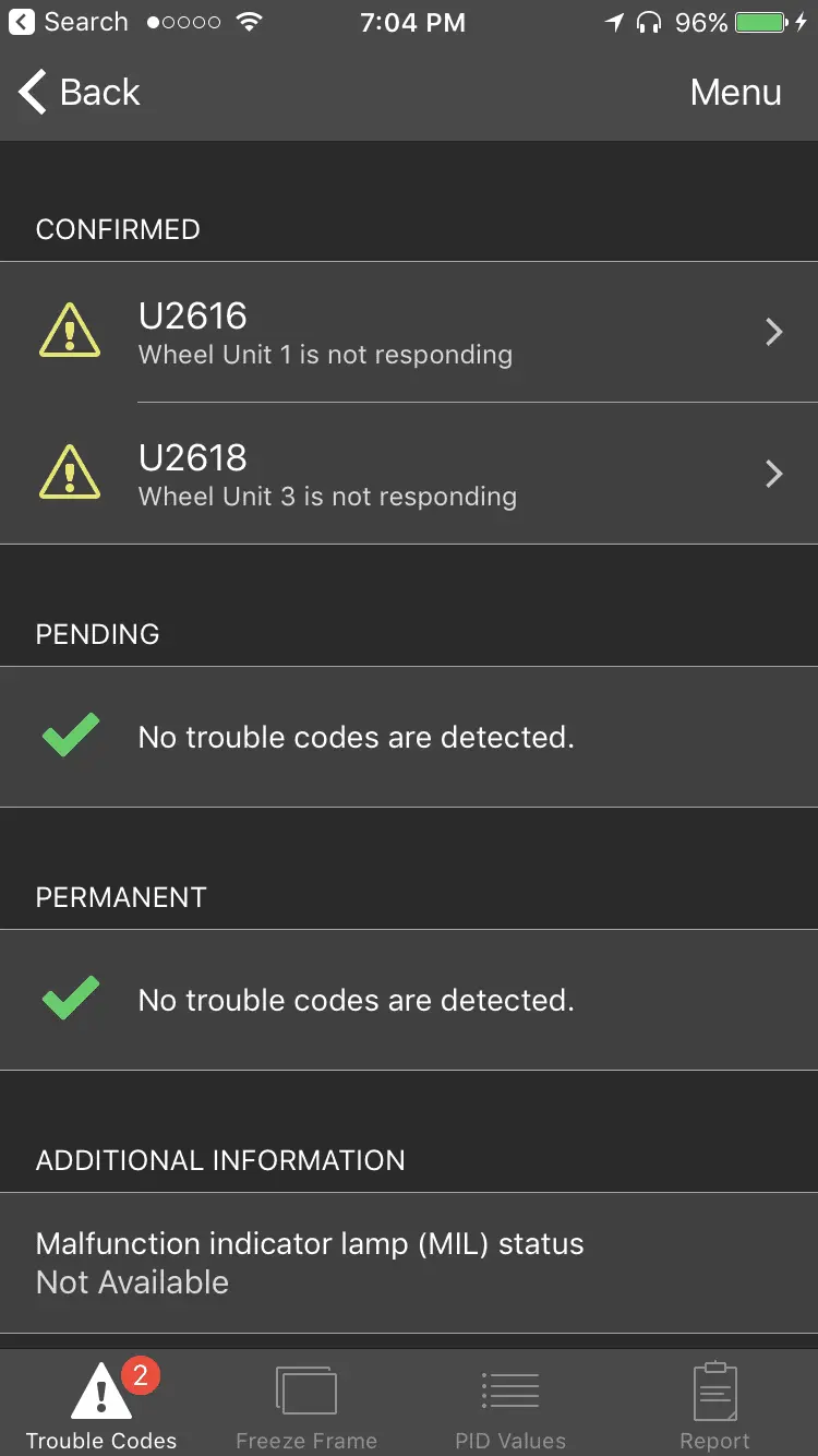 Using OBD Fusion with the Mazda5 add on, I was able to determine that "Wheel Unit #3 not responding". During driving I've gotten errors: U2618 (wheel unit #3), and U2616 (wheel unit #1)